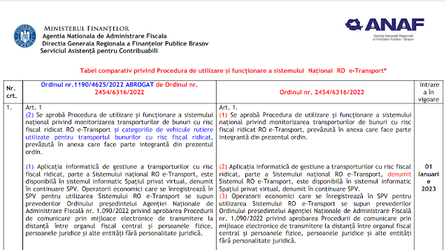Tabel comparativ privind Procedura de utilizare și funcționare a sistemului național RO e-Transport (material informativ publicat în data de 30.12.2022)