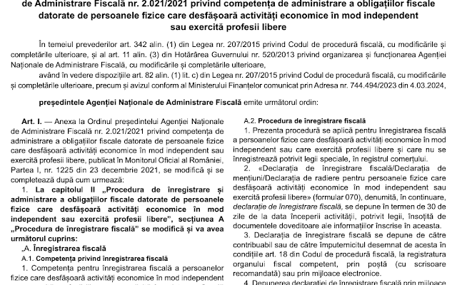 - Modificări aduse Ordinului ANAF nr.2021/2021 privind competența de administrare a obligațiilor fiscale datorate de persoanele fizice care desfășoară activități economice în mod independent sau exercită profesii libere.