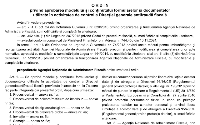 O.P.A.N.A.F. nr. 128/27.01.2025 privind aprobarea modelului și conținutului formularelor și documentelor utilizate în activitatea de control a Direcției generale antifraudă fiscală