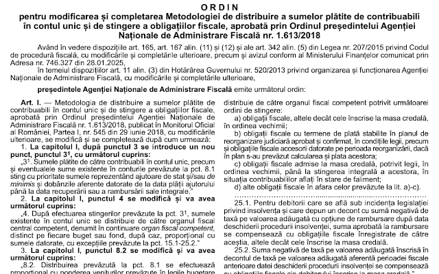 O.P.A.N.A.F. nr. 146/31.01.2025 pentru modificarea și completarea Metodologiei de distribuire a sumelor plătite de contribuabili în contul unic și de stingere a obligațiilor fiscale, aprobată prin Ordinul președintelui Agenției Naționale de Administrare Fiscală nr. 1.613/2018
