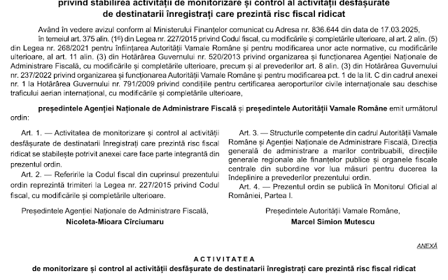 Ordinul comun al P.A.N.A.F. și al P.A.V.R. nr. 418/1.206/2025 privind stabilirea activității de monitorizare și control al activității desfășurate de destinatarii înregistrați care prezintă risc fiscal ridicat